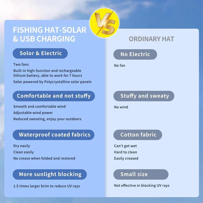 ✓ No more sweaty hat hair ✓ No bulky batteries ✓ No sunburn regrets
