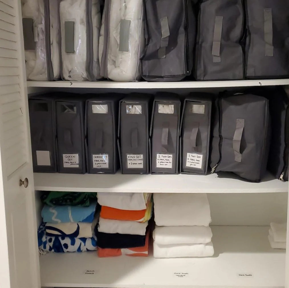Schluss mit der frustrierenden Suche in unordentlichen Stapeln, sondern mit unseren Bettlaken-Organizern können Sie Ihre Bettlaken ordentlich organisieren und leicht zugänglich aufbewahren. Dank individueller Etiketten und durchsichtiger Fenster finden Sie schnell und ohne Aufwand genau die Laken, die Sie brauchen.
